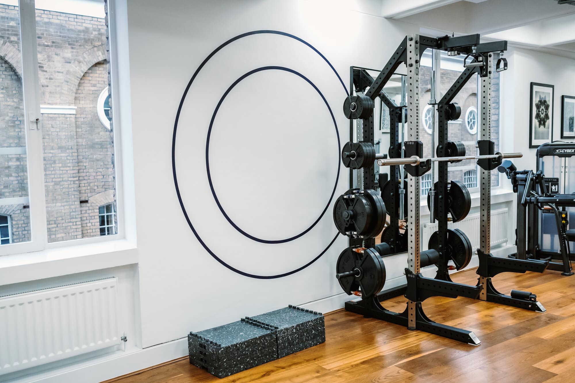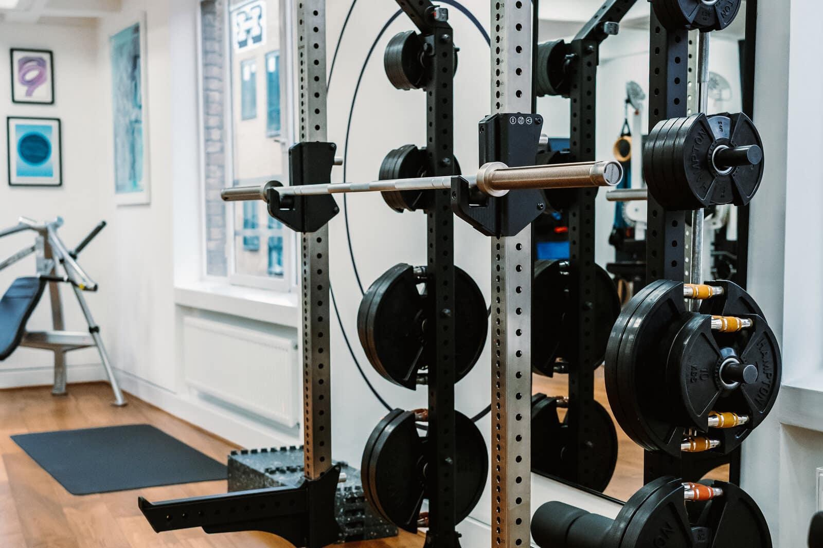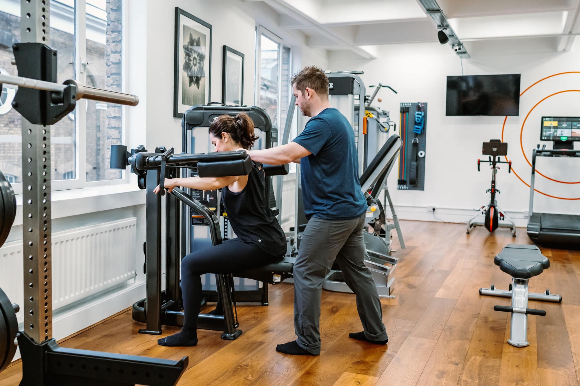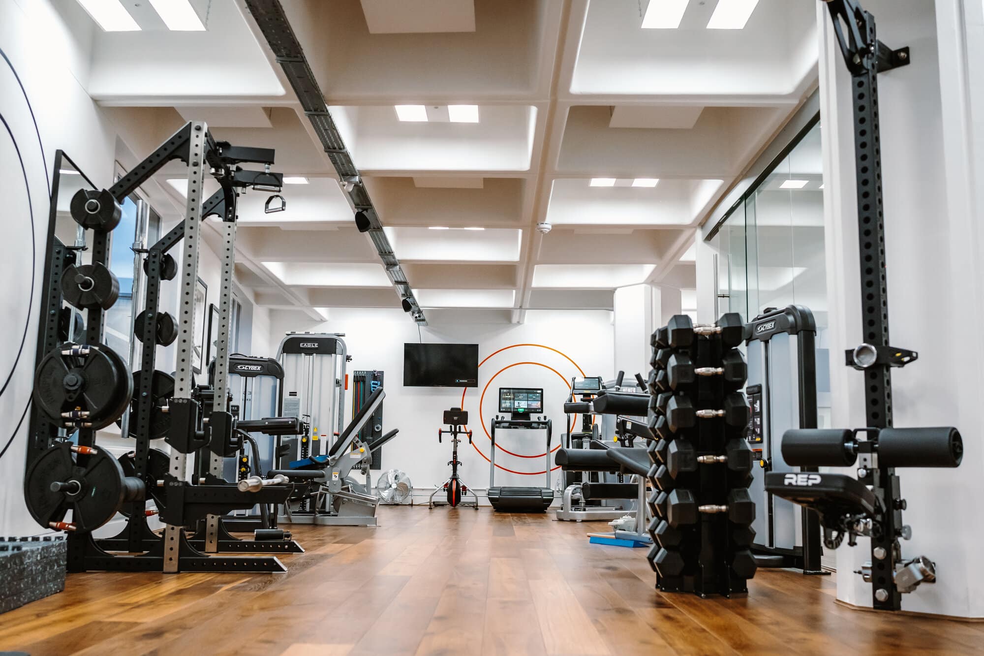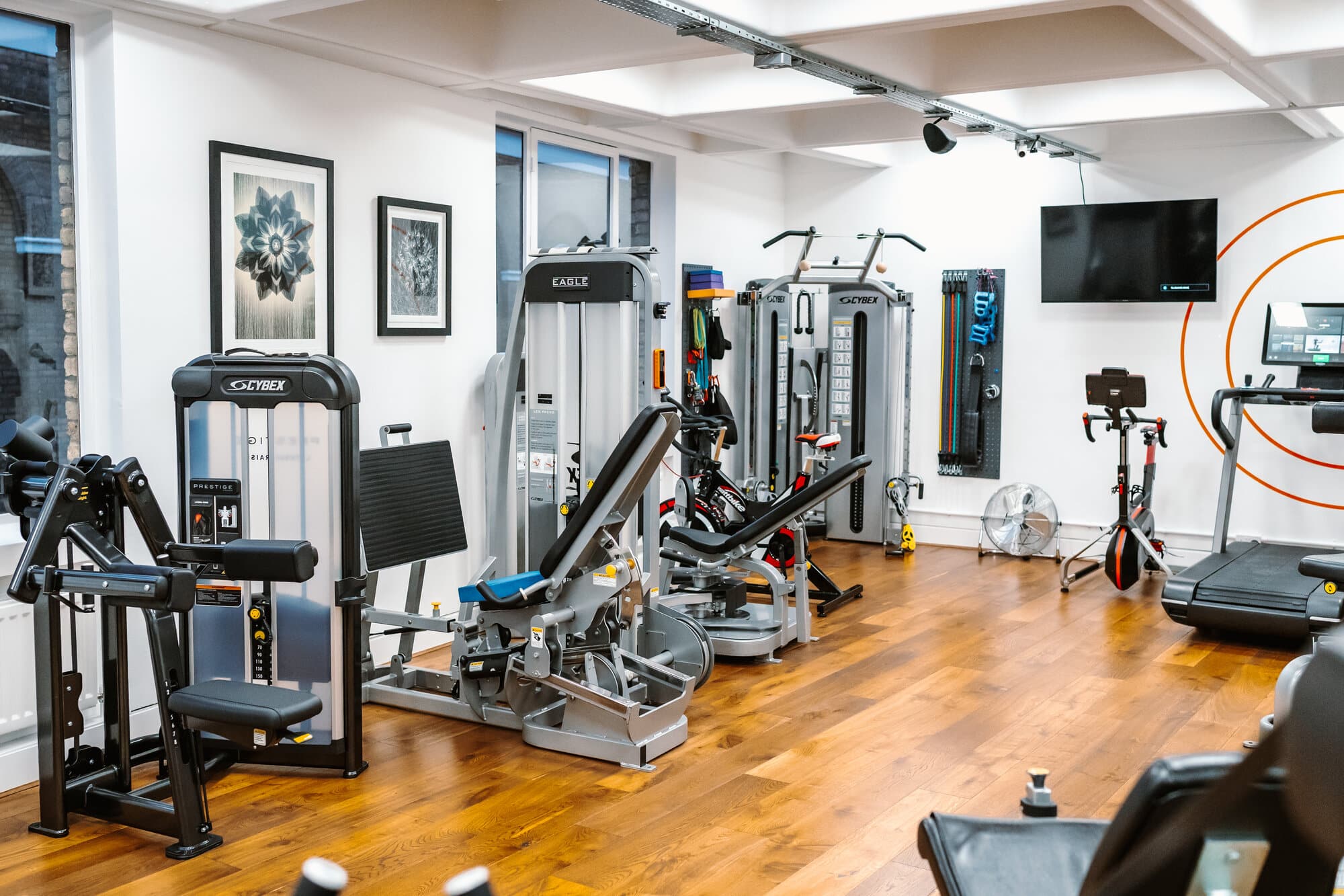 Resistance machines selected and adjusted over 29 years - cam profiles, lever systems, and cable arrangements designed for specific goals. TechnoGym treadmill, stepper, and WattBike Pro for cardiovascular work.